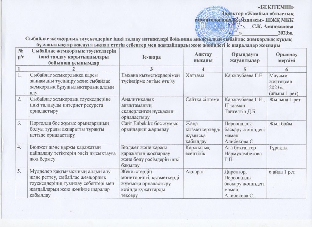 ГКП на ПХВ «Жамбылская областная стоматологическая поликлиника» управление здравоохранения акимата Жамбылской области» сообщает, что в период с 1 по 30 июня 2023 года будет проведен внутренний анализ коррупционных рисков»
